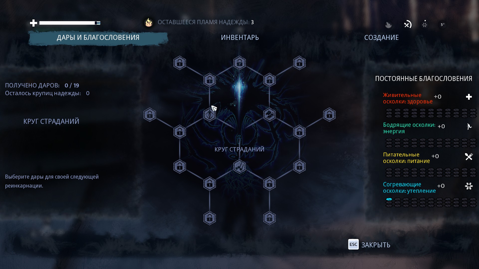 «Дары», позволяющие начинать новую игру с бонусами – ведь каждый раз, когда все свечи заканчиваются, игра начинается заново – лагерь вновь сгорает, неадекватная дочь [любящая потанцевать, пока батя приполз весь охреневший, голодный и замерзший, да, самое время потанцевать, маленькая с*ка] вновь плачет на весь двор, а игра обновляет карту – вперед, все заново, пока Злобный Дух вконец не будет повержен.