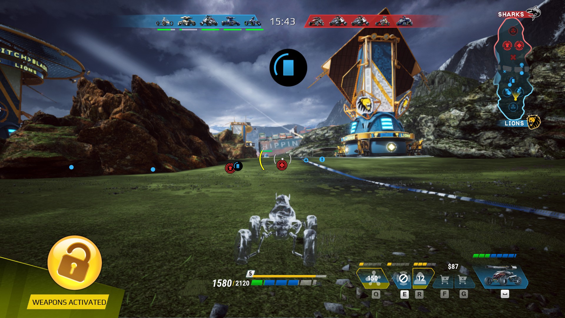 Две команды – Акулы и Львы воюют между собой в удовольствие, и вместо бегущих по линиям самоотверженных крипов здесь – роботы на колесах, спокойно и без драмы валящие друг друга в уличных перестрелках.